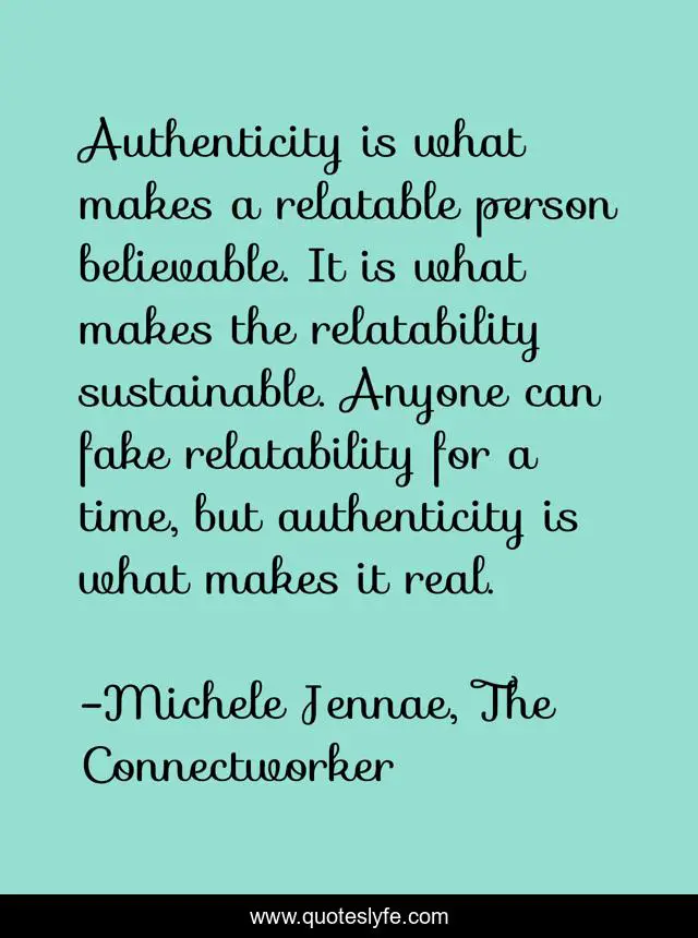 This page presents the quote "Authenticity is what makes a relatable person believable. It is what makes the relatability sustainable. Anyone can fake relatability for a time, but authenticity is what makes it real.". Author of this quote is Michele Jennae, The Connectworker. This quote is about business-relations, networking, believability, relatability, authenticity,.