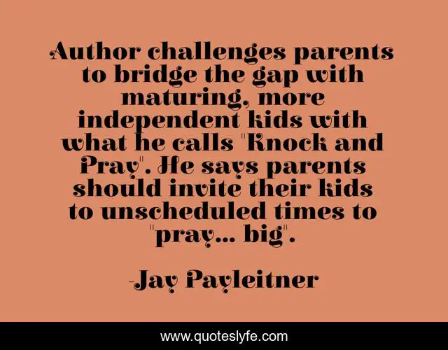 This page presents the quote "Author challenges parents to bridge the gap with maturing, more independent kids with what he calls "Knock and Pray". He says parents should invite their kids to unscheduled times to "pray... big".". Author of this quote is Jay Payleitner. This quote is about parenthood, family, prayer,.