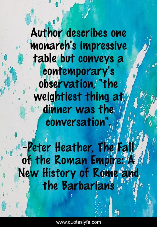 This page presents the quote "Author describes one monarch's impressive table but conveys a contemporary's observation, "the weightiest thing at dinner was the conversation".". Author of this quote is Peter Heather, The Fall of the Roman Empire: A New History of Rome and the Barbarians. This quote is about discourse, influence, ideas,.