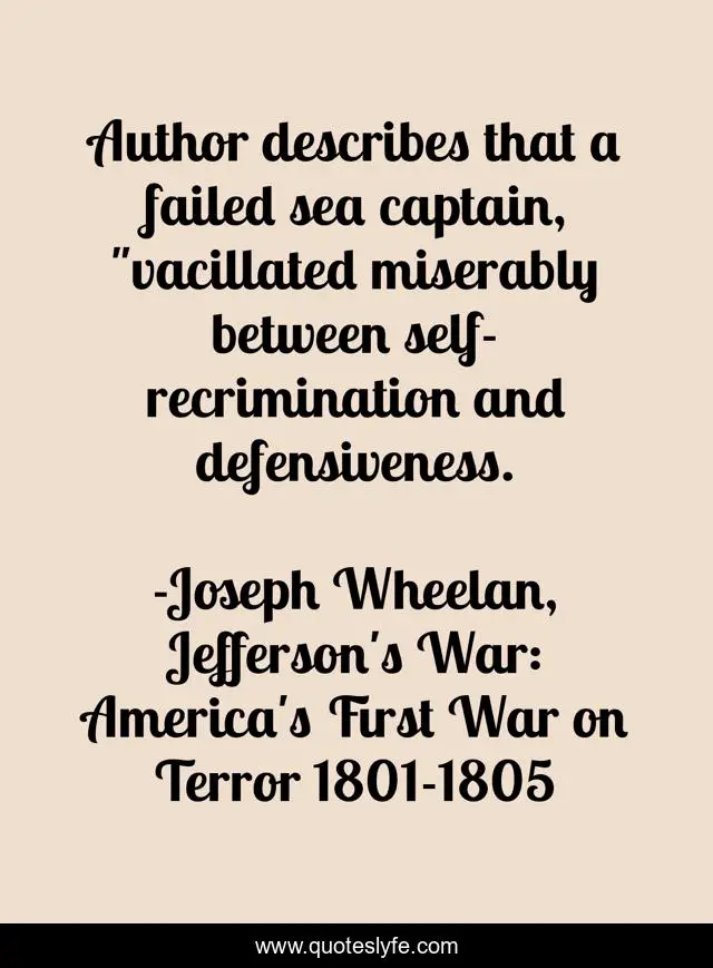 This page presents the quote "Author describes that a failed sea captain, "vacillated miserably between self-recrimination and defensiveness.". Author of this quote is Joseph Wheelan, Jefferson's War: America's First War on Terror 1801-1805. This quote is about condemnation, pride, depression,.