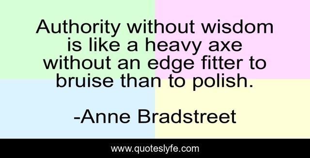 This page presents the quote "Authority without wisdom is like a heavy axe without an edge fitter to bruise than to polish.". Author of this quote is Anne Bradstreet. .