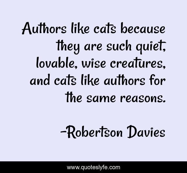 This page presents the quote "Authors like cats because they are such quiet, lovable, wise creatures, and cats like authors for the same reasons.". Author of this quote is Robertson Davies. This quote is about cats, books, authors,.