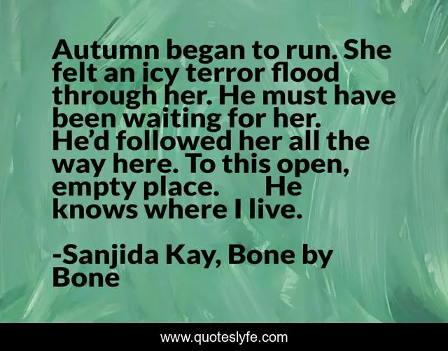 This page presents the quote "Autumn began to run. She felt an icy terror flood through her. He must have been waiting for her. He’d followed her all the way here. To this open, empty place. He knows where I live.". Author of this quote is Sanjida Kay, Bone by Bone. .