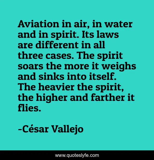 This page presents the quote "Aviation in air, in water and in spirit. Its laws are different in all three cases. The spirit soars the more it weighs and sinks into itself. The heavier the spirit, the higher and farther it flies.". Author of this quote is César Vallejo. .