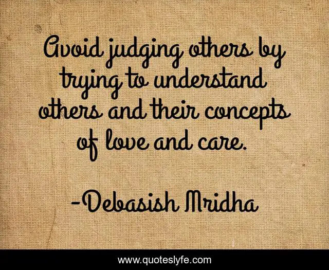 This page presents the quote "Avoid judging others by trying to understand others and their concepts of love and care.". Author of this quote is Debasish Mridha. This quote is about love, philosophy, debasish-mridha, quotes, debasish-mridha-md, inspirational, judging, understand-others, judging-others,.