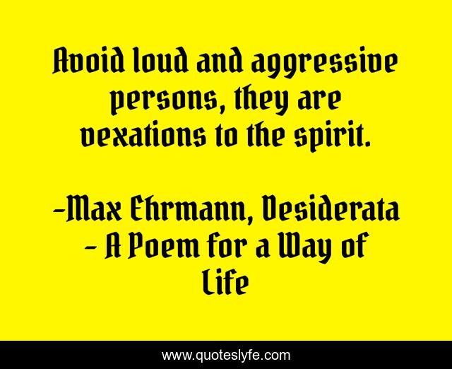"Max Ehrmann, Desiderata - A Poem for a Way of Life Quotes." Quoteslyfe.com, 2025. Mon. 08 Dec. 2025. <https://www.quoteslyfe.com/quote/Avoid-loud-and-aggressive-persons-they-are-4577>.