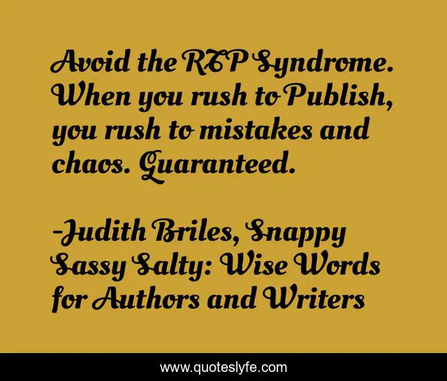 This page presents the quote "Avoid the RTP Syndrome. When you rush to Publish, you rush to mistakes and chaos. Guaranteed.". Author of this quote is Judith Briles, Snappy Sassy Salty: Wise Words for Authors and Writers. This quote is about publishing-mistakes, authors, hot-to-get-published,.