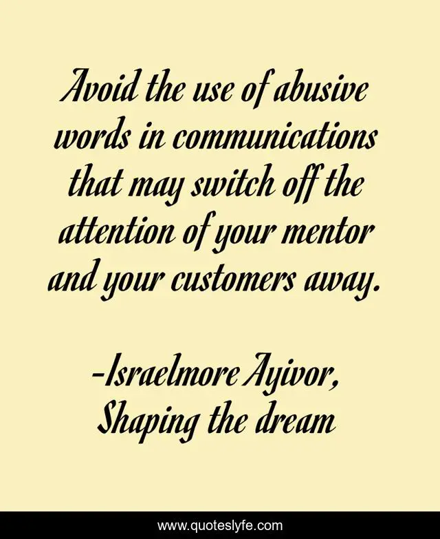 This page presents the quote "Avoid the use of abusive words in communications that may switch off the attention of your mentor and your customers away.". Author of this quote is Israelmore Ayivor, Shaping the dream. This quote is about companions, communication, connections, abusive-words, connect, networking, insulting, don-t-do-it, avoid,.