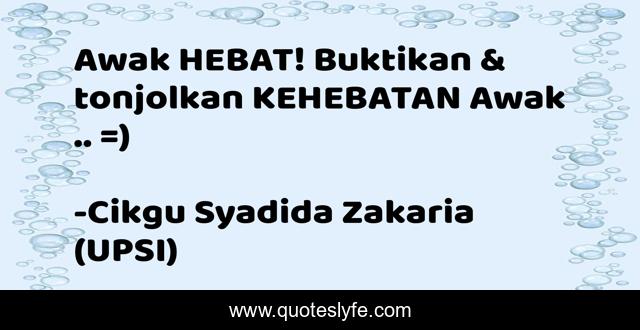 "Cikgu Syadida Zakaria (UPSI) Quotes." Quoteslyfe.com, 2025. Sat. 06 Dec. 2025. <https://www.quoteslyfe.com/quote/Awak-HEBAT-Buktikan-tonjolkan-KEHEBATAN-Awak-14606>.