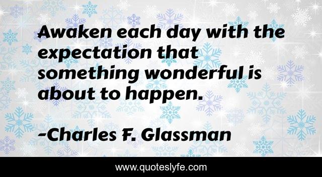 This page presents the quote "Awaken each day with the expectation that something wonderful is about to happen.". Author of this quote is Charles F. Glassman. This quote is about confidence, positive, motivational, expectation, intention, optimistic, inspirational, enthusiasm,.