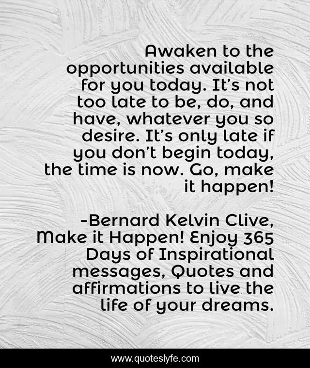 This page presents the quote "Awaken to the opportunities available for you today. It’s not too late to be, do, and have, whatever you so desire. It’s only late if you don’t begin today, the time is now. Go, make it happen!". Author of this quote is Bernard Kelvin Clive, Make it Happen! Enjoy 365 Days of Inspirational messages, Quotes and affirmations to live the life of your dreams.. This quote is about desires, enthusiasm, oppurtunity, dreams, inspirational,.