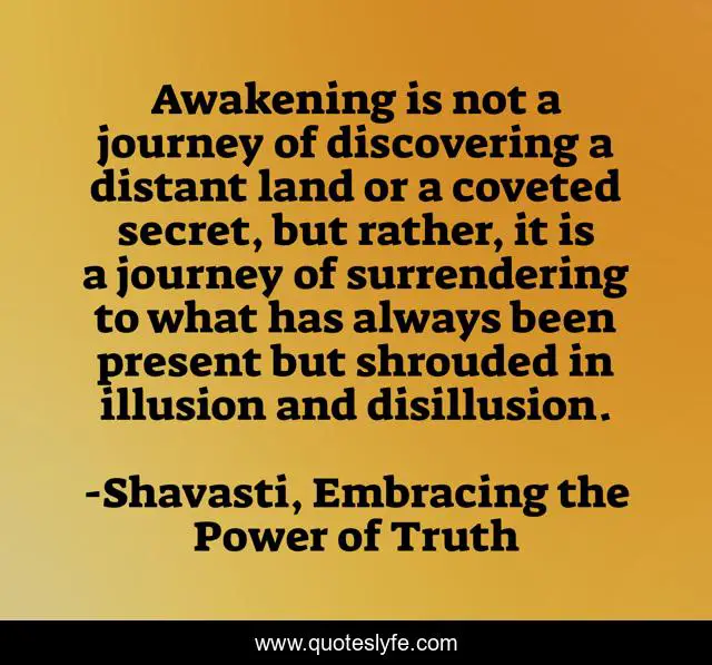 This page presents the quote "Awakening is not a journey of discovering a distant land or a coveted secret, but rather, it is a journey of surrendering to what has always been present but shrouded in illusion and disillusion.". Author of this quote is Shavasti, Embracing the Power of Truth. This quote is about spirituality, awakening, healing,.