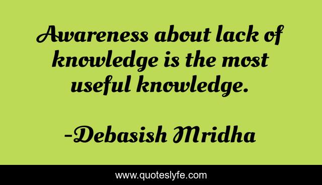 This page presents the quote "Awareness about lack of knowledge is the most useful knowledge.". Author of this quote is Debasish Mridha. This quote is about life, love, knowledge, inspirational, intelligence, philosophy, affection, wisdom, awareness,.