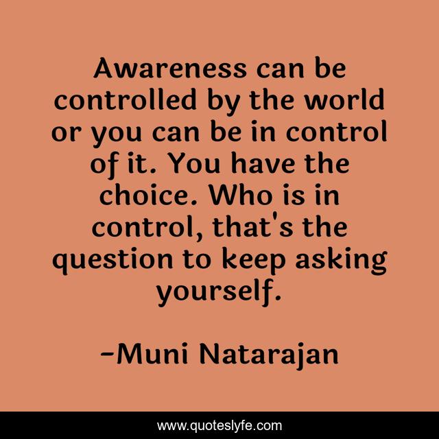 This page presents the quote "Awareness can be controlled by the world or you can be in control of it. You have the choice. Who is in control, that's the question to keep asking yourself.". Author of this quote is Muni Natarajan. This quote is about life, life-lessons, wisdom,.