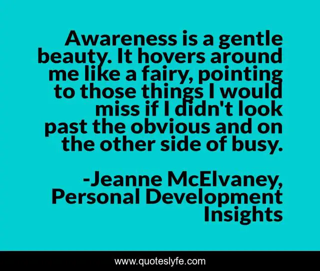 This page presents the quote "Awareness is a gentle beauty. It hovers around me like a fairy, pointing to those things I would miss if I didn't look past the obvious and on the other side of busy.". Author of this quote is Jeanne McElvaney, Personal Development Insights. This quote is about being-happy, self-awareness, old-maggie-s-spirit-whispers, change-your-life, life-purpose, gotospirit-com, jeanne-mcelvaney, self-improvement, personal-development,.