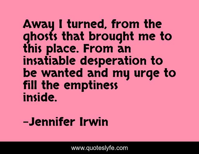 This page presents the quote "Away I turned, from the ghosts that brought me to this place. From an insatiable desperation to be wanted and my urge to fill the emptiness inside.". Author of this quote is Jennifer Irwin. This quote is about author, writer, healing, book-bookworm,.