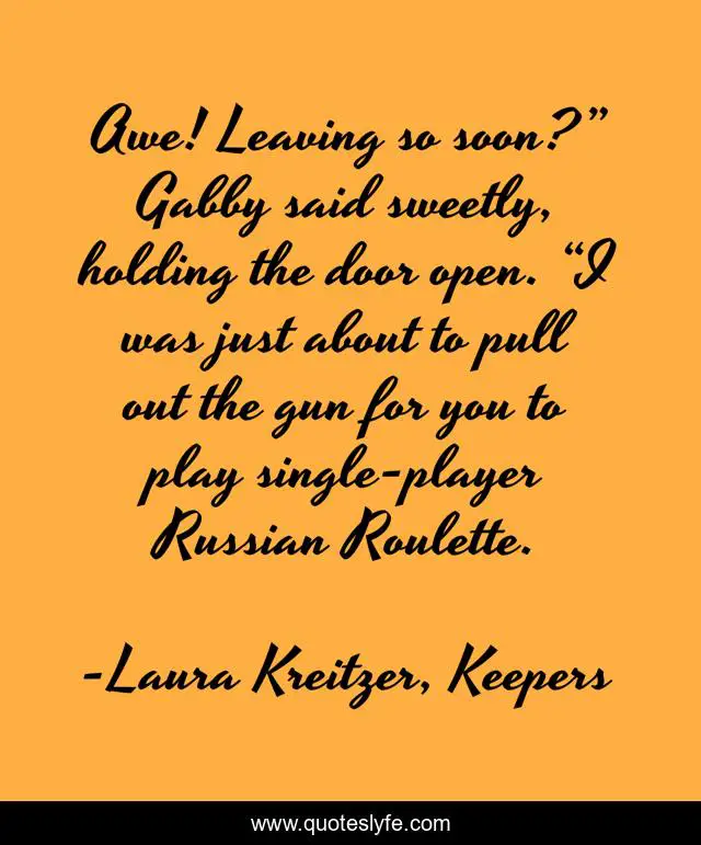 This page presents the quote "Awe! Leaving so soon?” Gabby said sweetly, holding the door open. “I was just about to pull out the gun for you to play single-player Russian Roulette.". Author of this quote is Laura Kreitzer, Keepers. This quote is about russian-roulette, humor, fantasy, ya, pnr, gabriella-moretti, keepers, fiction, timeless-series,.