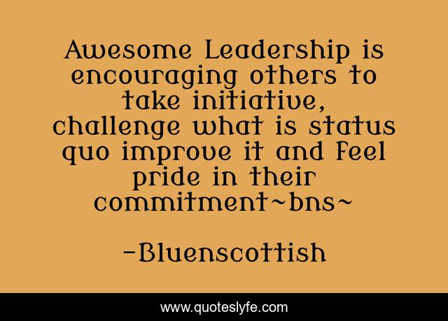 This page presents the quote "Awesome Leadership is encouraging others to take initiative, challenge what is status quo improve it and feel pride in their commitment~bns~". Author of this quote is Bluenscottish. This quote is about challenge, leadership, bluenscottish, commitment, inspiration,.