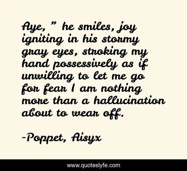 This page presents the quote "Aye, ” he smiles, joy igniting in his stormy gray eyes, stroking my hand possessively as if unwilling to let me go for fear I am nothing more than a hallucination about to wear off.". Author of this quote is Poppet, Aisyx. This quote is about paranormal-romance, vampire-romance,.