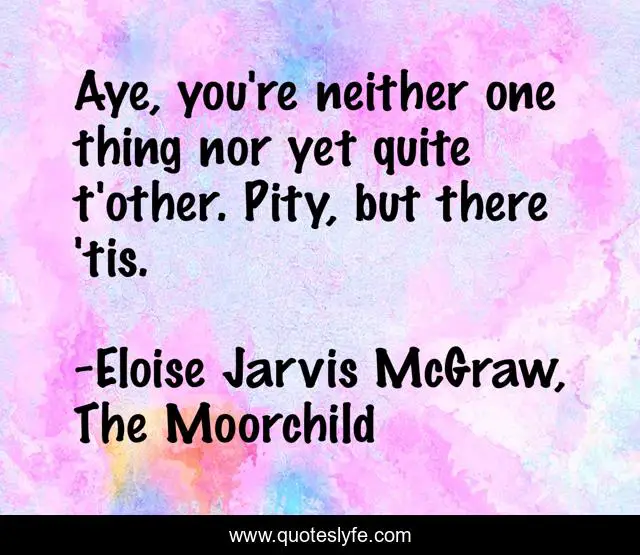 This page presents the quote "Aye, you're neither one thing nor yet quite t'other. Pity, but there 'tis.". Author of this quote is Eloise Jarvis McGraw, The Moorchild. This quote is about different, moorchild, fantasy, sasski, folktales, moql,.