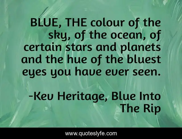 This page presents the quote "BLUE, THE colour of the sky, of the ocean, of certain stars and planets and the hue of the bluest eyes you have ever seen.". Author of this quote is Kev Heritage, Blue Into The Rip. This quote is about teen, sci-fi, time-travel, adventure, climate-change, young-adult,.