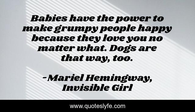 This page presents the quote "Babies have the power to make grumpy people happy because they love you no matter what. Dogs are that way, too.". Author of this quote is Mariel Hemingway, Invisible Girl. This quote is about love, power, compassion, heartwarming, dog, therapy, animal, therapy-dogs, baby,.