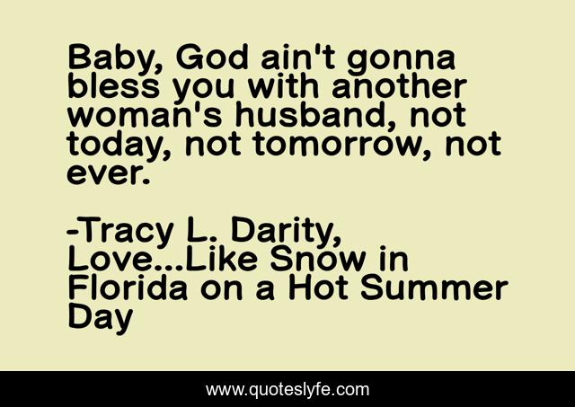 This page presents the quote "Baby, God ain't gonna bless you with another woman's husband, not today, not tomorrow, not ever.". Author of this quote is Tracy L. Darity, Love...Like Snow in Florida on a Hot Summer Day. This quote is about relationships, love, affection, fiction,.
