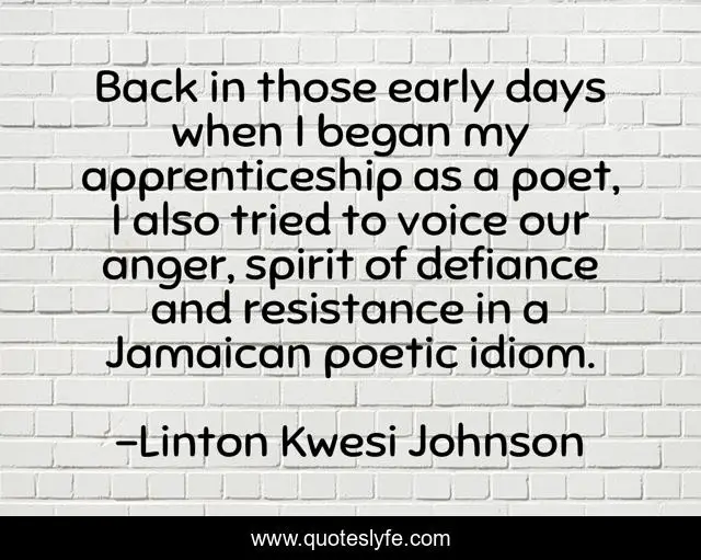 This page presents the quote "Back in those early days when I began my apprenticeship as a poet, I also tried to voice our anger, spirit of defiance and resistance in a Jamaican poetic idiom.". Author of this quote is Linton Kwesi Johnson. This quote is about early, voice, resistance,.