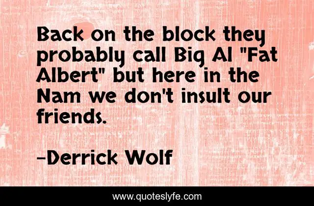 This page presents the quote "Back on the block they probably call Big Al "Fat Albert" but here in the Nam we don't insult our friends.". Author of this quote is Derrick Wolf. This quote is about military, vietnam, war, army,.