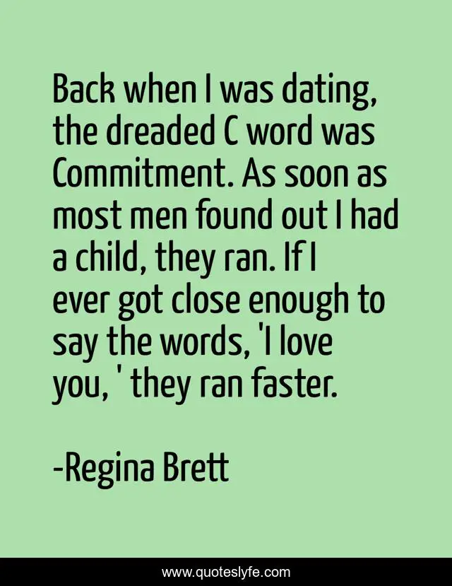 This page presents the quote "Back when I was dating, the dreaded C word was Commitment. As soon as most men found out I had a child, they ran. If I ever got close enough to say the words, 'I love you, ' they ran faster.". Author of this quote is Regina Brett. This quote is about i love you, love, words, affection,.