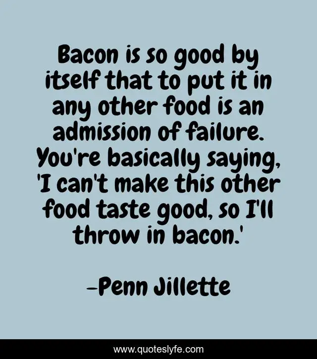 This page presents the quote "Bacon is so good by itself that to put it in any other food is an admission of failure. You're basically saying, 'I can't make this other food taste good, so I'll throw in bacon.'". Author of this quote is Penn Jillette. This quote is about food, saying, good,.