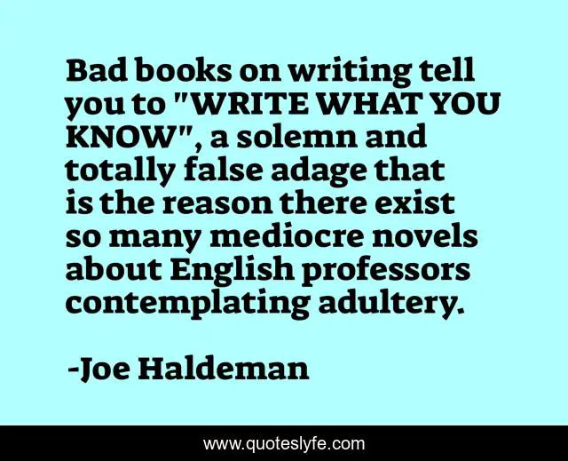 This page presents the quote "Bad books on writing tell you to "WRITE WHAT YOU KNOW", a solemn and totally false adage that is the reason there exist so many mediocre novels about English professors contemplating adultery.". Author of this quote is Joe Haldeman. This quote is about adultery, writing,.