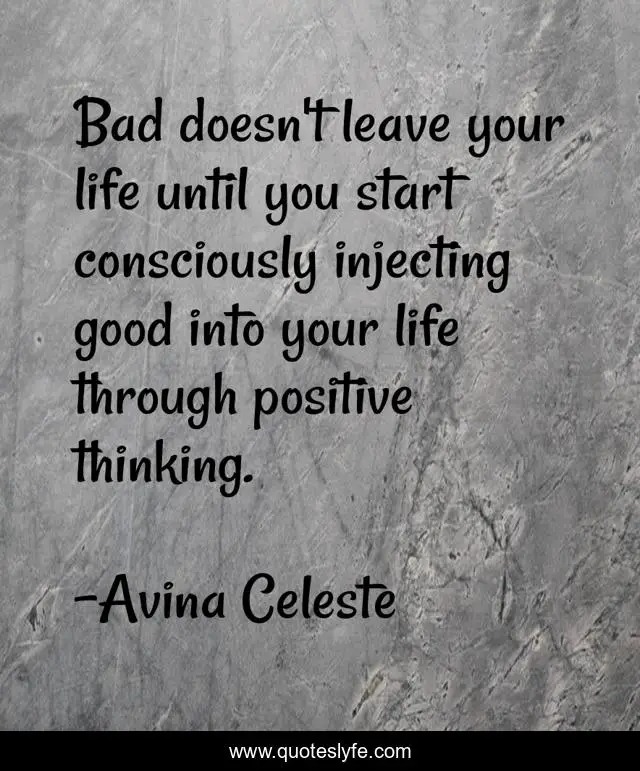 This page presents the quote "Bad doesn't leave your life until you start consciously injecting good into your life through positive thinking.". Author of this quote is Avina Celeste. This quote is about life, good, thinking, positive, positivity, motivational, confidence, bad, optimistic,.