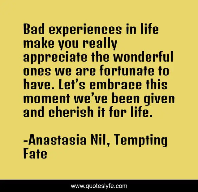 This page presents the quote "Bad experiences in life make you really appreciate the wonderful ones we are fortunate to have. Let’s embrace this moment we’ve been given and cherish it for life.". Author of this quote is Anastasia Nil, Tempting Fate. This quote is about love, affection,.