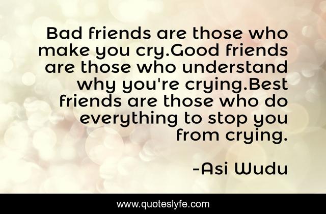This page presents the quote "Bad friends are those who make you cry.Good friends are those who understand why you're crying.Best friends are those who do everything to stop you from crying.". Author of this quote is Asi Wudu. This quote is about friendship, self-awareness, true-friendship, friendship-and-love, inspirational, love-and-friendship, enthusiasm, true-friends,.
