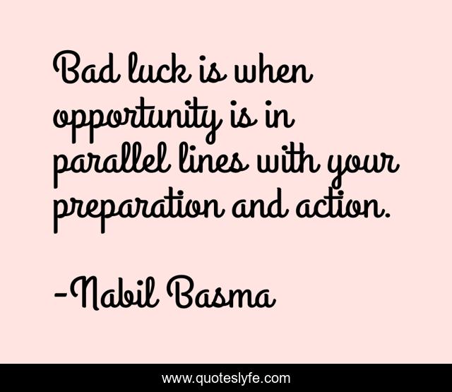 This page presents the quote "Bad luck is when opportunity is in parallel lines with your preparation and action.". Author of this quote is Nabil Basma. .