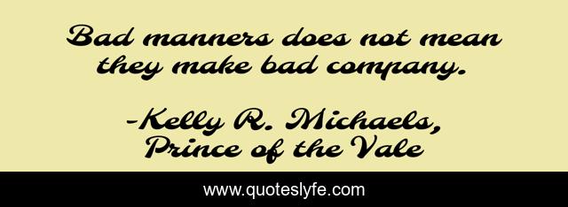 This page presents the quote "Bad manners does not mean they make bad company.". Author of this quote is Kelly R. Michaels, Prince of the Vale. This quote is about fantasy, ariang-ron, caelfel, gravanna, prince-of-the-vale,.