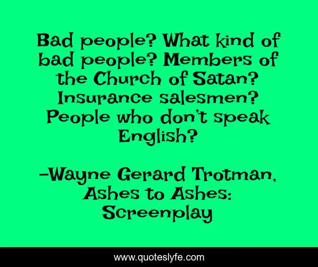 This page presents the quote "Bad people? What kind of bad people? Members of the Church of Satan? Insurance salesmen? People who don’t speak English?". Author of this quote is Wayne Gerard Trotman, Ashes to Ashes: Screenplay. This quote is about people, michael-trent, satanism, satanists, satan, english, bad-people, foreign-language, insurance-salesmen,.