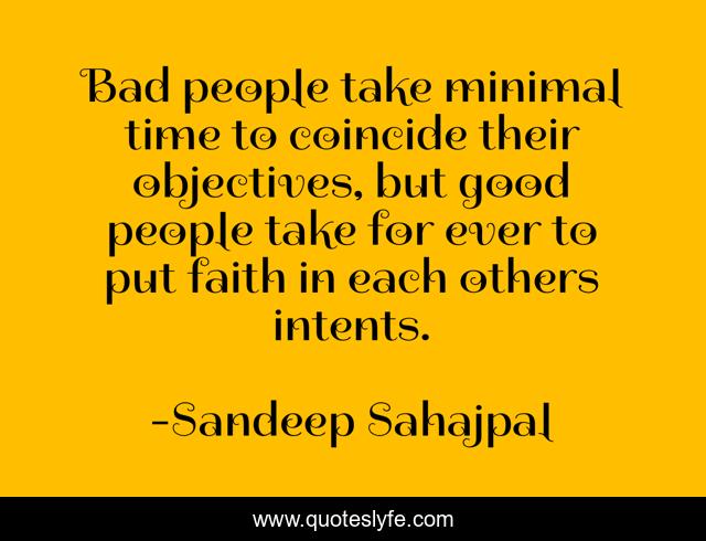 This page presents the quote "Bad people take minimal time to coincide their objectives, but good people take for ever to put faith in each others intents.". Author of this quote is Sandeep Sahajpal. .