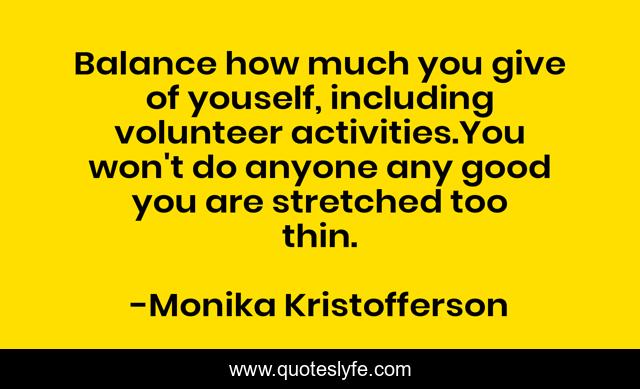 This page presents the quote "Balance how much you give of youself, including volunteer activities.You won't do anyone any good you are stretched too thin.". Author of this quote is Monika Kristofferson. This quote is about balanced-life, balance, balance-life,.