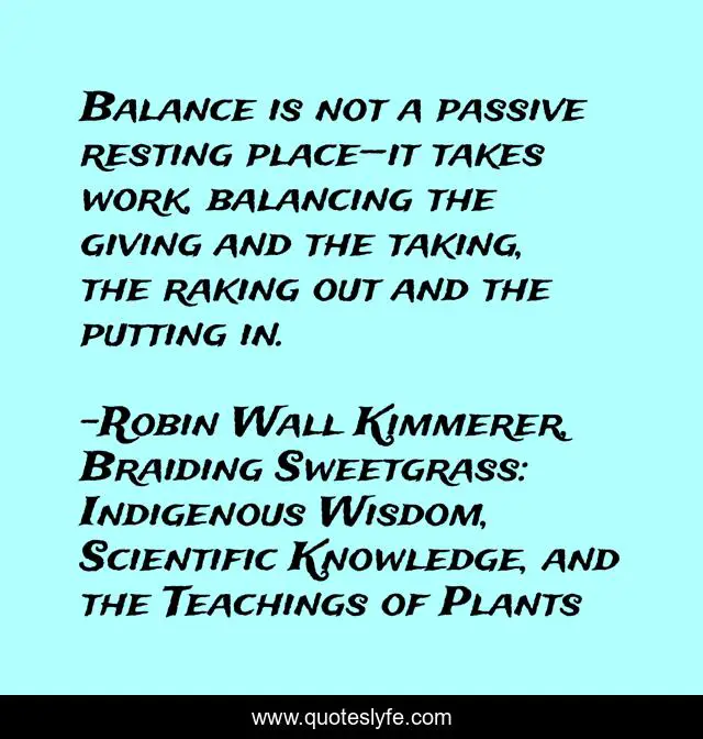"Robin Wall Kimmerer, Braiding Sweetgrass: Indigenous Wisdom, Scientific Knowledge, and the Teachings of Plants Quotes." Quoteslyfe.com, 2025. Fri. 05 Dec. 2025. <https://www.quoteslyfe.com/quote/Balance-is-not-a-passive-resting-place-252210>.