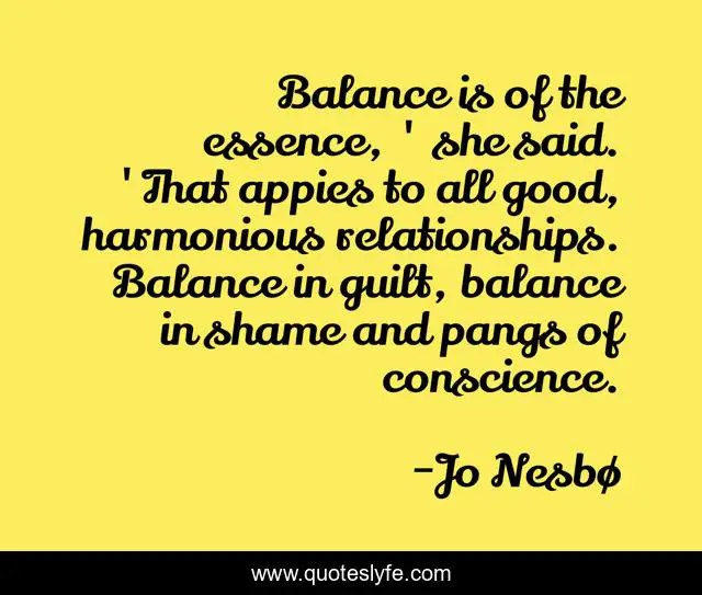 This page presents the quote "Balance is of the essence, ' she said. 'That appies to all good, harmonious relationships. Balance in guilt, balance in shame and pangs of conscience.". Author of this quote is Jo Nesbø. This quote is about relationships, balance,.