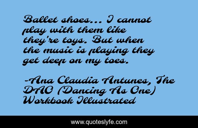 This page presents the quote "Ballet shoes... I cannot play with them like they're toys. But when the music is playing they get deep on my toes.". Author of this quote is Ana Claudia Antunes, The DAO (Dancing As One) Workbook Illustrated. This quote is about inspirational-attitude, ballet, toes, dancing, dance, dao, exercise-motivation, motivation, training-and-development,.