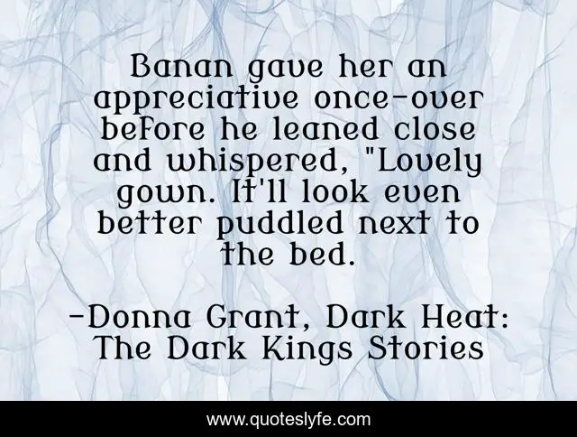 This page presents the quote "Banan gave her an appreciative once-over before he leaned close and whispered, "Lovely gown. It'll look even better puddled next to the bed.". Author of this quote is Donna Grant, Dark Heat: The Dark Kings Stories. This quote is about scottish-dragon-kings-romance, paranormal-romance,.
