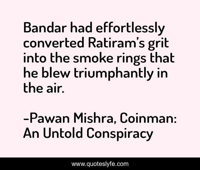 This page presents the quote "Bandar had effortlessly converted Ratiram’s grit into the smoke rings that he blew triumphantly in the air.". Author of this quote is Pawan Mishra, Coinman: An Untold Conspiracy. This quote is about ignorance, arrogance, bullying, smoking, boss, contempt,.