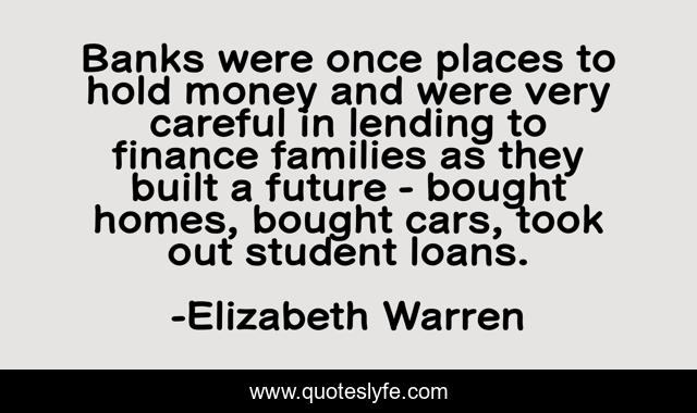 This page presents the quote "Banks were once places to hold money and were very careful in lending to finance families as they built a future - bought homes, bought cars, took out student loans.". Author of this quote is Elizabeth Warren. This quote is about money, future, student,.