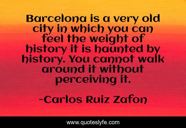 This page presents the quote "Barcelona is a very old city in which you can feel the weight of history it is haunted by history. You cannot walk around it without perceiving it.". Author of this quote is Carlos Ruiz Zafon. This quote is about city, walk,.