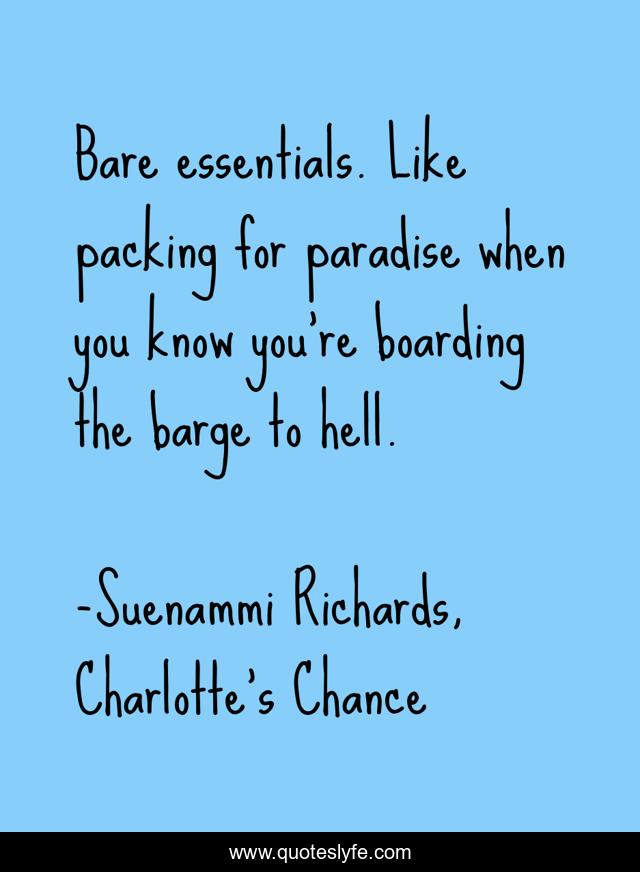 This page presents the quote "Bare essentials. Like packing for paradise when you know you’re boarding the barge to hell.". Author of this quote is Suenammi Richards, Charlotte's Chance. This quote is about romance, love, conflict, affection,.