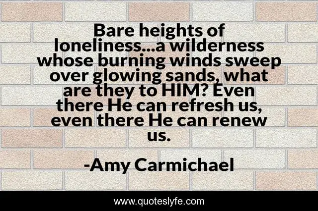This page presents the quote "Bare heights of loneliness...a wilderness whose burning winds sweep over glowing sands, what are they to HIM? Even there He can refresh us, even there He can renew us.". Author of this quote is Amy Carmichael. This quote is about windows, god, amy-carmichael,.