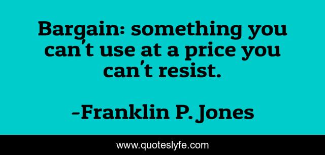 This page presents the quote "Bargain: something you can't use at a price you can't resist.". Author of this quote is Franklin P. Jones. This quote is about selling, buying,.